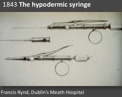 En 1853, Alexander Wood, utilizó la aguja inventada por Francis e inyectó morfina a una mujer que padecía de neuralgia, en el punto exacto del dolor, con una eficacia del cien por ciento, la diferencia fue que utilizó un émbolo con lo que creó la jeringa hipodérmica tal y como la conocemos hoy en día.