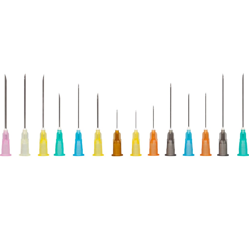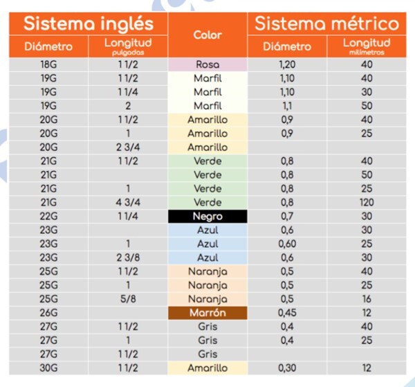 VERDE: Uso intramuscular o intravenoso: vacunas y otros fármacos, como analgésicos, antiinflamatorios, antibióticos, etc. Normalmente aguja intravenosa: 0,8 x 25 mm (21 G 1) I aguja intramuscular:0,8 x 40 mm (21 G 1 1/2) AMARILLA O GRIS: Uso intradérmico, pruebas cutáneas y anestésicos locales. Normalmente aguja 0,3 x 12 mm (30 G 1/2″) o aguja 27 G (1 1/2) AMARILLA: Uso intravenoso/intramuscular. Normalmente aguja 0,9 x 25 mm (20 G 1) NARANJA: Uso subcutáneo insulinas, vacunas, etc. Normalmente aguja 0,5 x 16 mm (25 G 5/8″) ROJA: Aguja de carga, con punta roma ( blunt Fill) para evitar pinchazos. Normalmente: 18G 1 1/2 1,2 x 40 mm