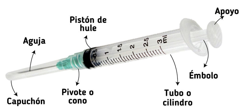 El émbolo: Es la parte de la jeringa que se introduce dentro del tubo y que permite el llenado o vaciado de medicamentos. Pistón de hule: Es la goma que se encuentra al final del émbolo y permite el sellado de forma correcta para que el líquido no salga al presionar. Apoyo: Es la zona donde se ejerce la presión con los dedos o mano sobre el émbolo y que permite introducir el líquido en la jeringa al poder succionar e introducir los medicamentos. Tubo: Es la parte donde se almacena el líquido que se extrae o se introduce en un cuerpo. En el cilindro se encuentra una escala en décimas, que permite saber la cantidad exacta de sustancia que se sustrae o se inyecta. El pivote: Es la parte del tubo donde se conecta la aguja. La aguja: Es la parte metálica que se conecta al pivote y al tubo además es punzante. La aguja termina en forma de punta denominada bisel, normalmente tiene un corte en diagonal que facilita la introducción en la piel y tejidos profundos. El capuchón: O cubierta, es el cilindro de plástico que cubre las agujas y permite un mecanismo de prevención de pinchazos.