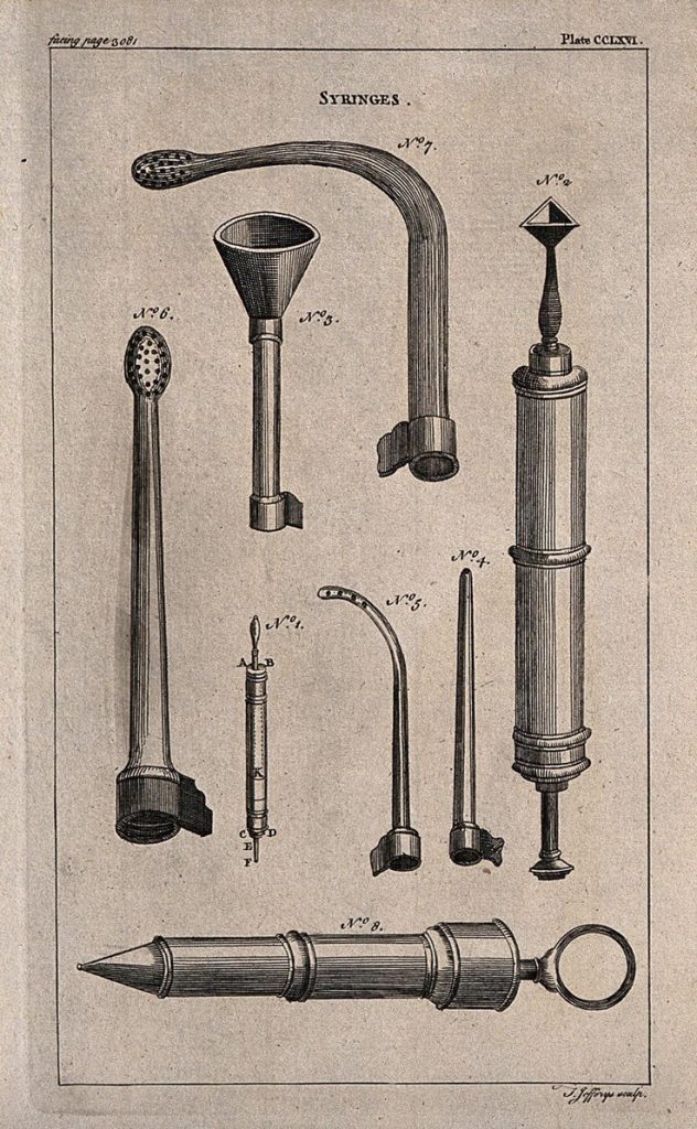 La gente en esa época les tenía el mismo miedo a las jeringas que a la enfermedad. En 1713, se crea el antecesor de la jeringa moderna, era el modelo creado por el cirujano francés, Dominique Anel, quien creo una jeringa fina con bomba para e tratamiento de los conductos lagrimales, y proceder con la limpieza a través de la succión.