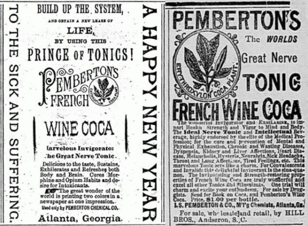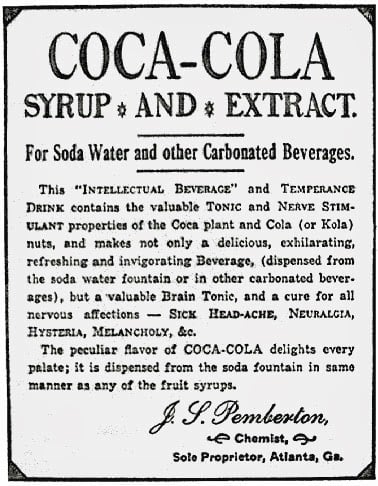 La primera fue Coca-Cola, fue inventada por un farmacéutico norteamericano llamado John S. Pemberton, el cual era un adicto a la morfina debido a que tuvieron que tratarle horribles heridas que se hizo luchando en la Guerra de Secesión. Cansado de esta terrible adicción hizo varias pruebas y en 1886, lanzó su refresco llamado Coca Cola, el cual contenía agua carbonatada, nuez de cola, vino y hojas de coca (¡sí, cocaína!). La bebida fue un éxito debido a que irónicamente causaba una gran adicción.