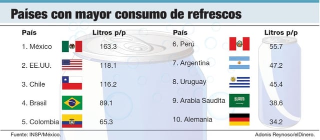 El consumo de refresco en México. Después de ver algunos ejemplos sobre la variedad de refrescos que tenemos en México, no es de extrañar que seamos el primer consumidor de estas bebidas a nivel mundial. Algunos estudiosos señalan que la falta de agua potable en comunidades alejadas influye a que lo único que sus pobladores consuman sea refrescos. Otro factor podría ser el acaparamiento de ríos o manantiales por parte de algunas refresqueras y embotelladoras que limita que los pobladores en esas zonas se vean también obligados a priorizar el consumo de refrescos sobre el agua. Cualquiera que sea el factor, México es el primer consumidor de refresco en el mundo con 163.3 litros per cápita al año.